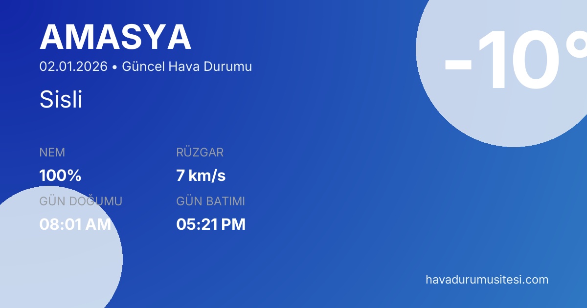 Amasya için güncel hava durumu amasya bilgileri. Meteoroloji verileri ile detaylı hava durumu tahminleri, sıcaklık, yağış, rüzgar ve nem bilgileri. MGM ve yandex hava durumu verileri ile güncel tahminler.