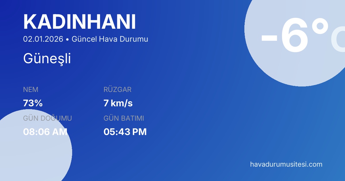 Kadinhani bölgesi için güncel hava durumu tahminleri, meteoroloji verileri ve detaylı hava durumu raporları. Sıcaklık değerleri, yağış olasılıkları, rüzgar hızı ve yönü, nem oranı ve görüş mesafesi bilgileri ile günlük planlarınızı yapabilirsiniz. MGM ve yandex hava durumu verileri ile güncel meteoroloji bilgilerine erişebilirsiniz.