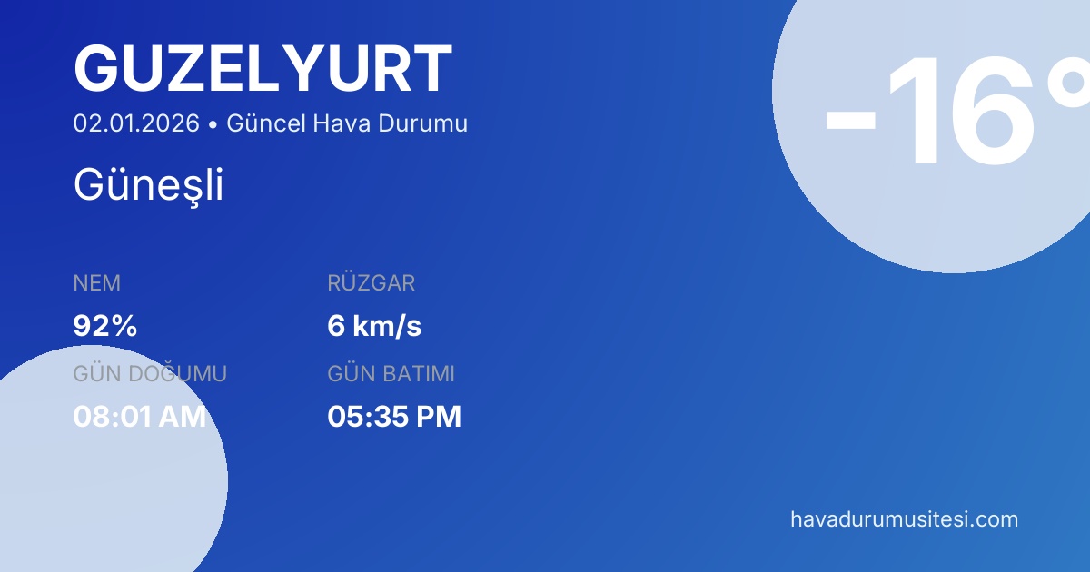 Güzelyurt bölgesi için güncel hava durumu tahminleri, meteoroloji verileri ve detaylı hava durumu raporları. Sıcaklık değerleri, yağış olasılıkları, rüzgar hızı ve yönü, nem oranı ve görüş mesafesi bilgileri ile günlük planlarınızı yapabilirsiniz. MGM ve yandex hava durumu verileri ile güncel meteoroloji bilgilerine erişebilirsiniz.