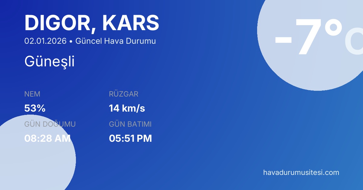 Di̇gor bölgesi için güncel hava durumu tahminleri, meteoroloji verileri ve detaylı hava durumu raporları. Sıcaklık değerleri, yağış olasılıkları, rüzgar hızı ve yönü, nem oranı ve görüş mesafesi bilgileri ile günlük planlarınızı yapabilirsiniz. MGM ve yandex hava durumu verileri ile güncel meteoroloji bilgilerine erişebilirsiniz.