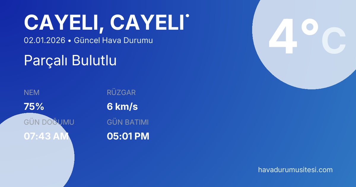 Çayeli̇ bölgesi için güncel hava durumu tahminleri, meteoroloji verileri ve detaylı hava durumu raporları. Sıcaklık değerleri, yağış olasılıkları, rüzgar hızı ve yönü, nem oranı ve görüş mesafesi bilgileri ile günlük planlarınızı yapabilirsiniz. MGM ve yandex hava durumu verileri ile güncel meteoroloji bilgilerine erişebilirsiniz.