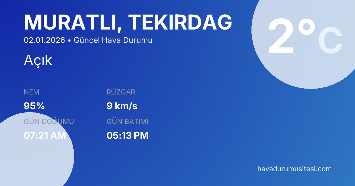 Muratli bölgesi için güncel hava durumu tahminleri, meteoroloji verileri ve detaylı hava durumu raporları. Sıcaklık değerleri, yağış olasılıkları, rüzgar hızı ve yönü, nem oranı ve görüş mesafesi bilgileri ile günlük planlarınızı yapabilirsiniz. MGM ve yandex hava durumu verileri ile güncel meteoroloji bilgilerine erişebilirsiniz.