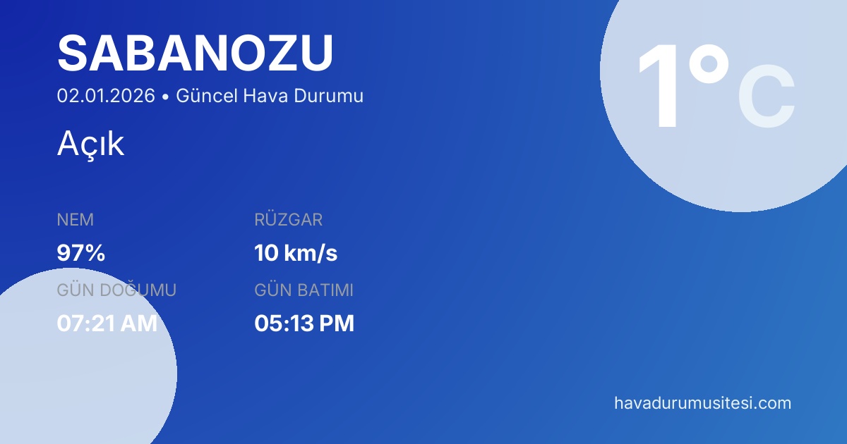 Şabanözü bölgesi için güncel hava durumu tahminleri, meteoroloji verileri ve detaylı hava durumu raporları. Sıcaklık değerleri, yağış olasılıkları, rüzgar hızı ve yönü, nem oranı ve görüş mesafesi bilgileri ile günlük planlarınızı yapabilirsiniz. MGM ve yandex hava durumu verileri ile güncel meteoroloji bilgilerine erişebilirsiniz.