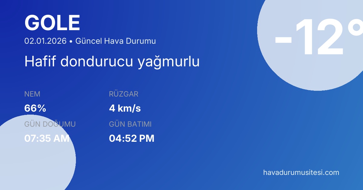 Göle için güncel mgm hava göle bilgileri. Meteoroloji verileri ile detaylı hava durumu tahminleri, sıcaklık, yağış, rüzgar ve nem bilgileri. MGM ve yandex hava durumu verileri ile güncel tahminler.