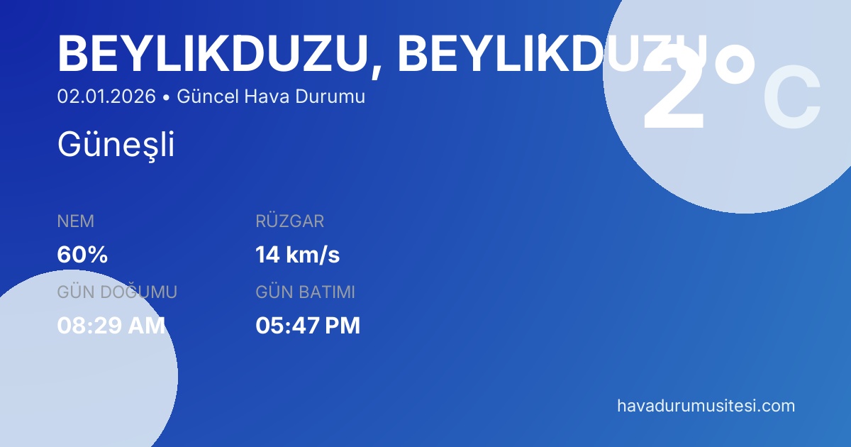 Beyli̇kdüzü için güncel mgm beyli̇kdüzü bilgileri. Meteoroloji verileri ile detaylı hava durumu tahminleri, sıcaklık, yağış, rüzgar ve nem bilgileri. MGM ve yandex hava durumu verileri ile güncel tahminler.