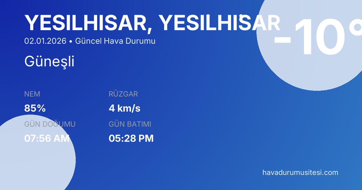 Yeşi̇lhi̇sar bölgesi için güncel hava durumu tahminleri, meteoroloji verileri ve detaylı hava durumu raporları. Sıcaklık değerleri, yağış olasılıkları, rüzgar hızı ve yönü, nem oranı ve görüş mesafesi bilgileri ile günlük planlarınızı yapabilirsiniz. MGM ve yandex hava durumu verileri ile güncel meteoroloji bilgilerine erişebilirsiniz.