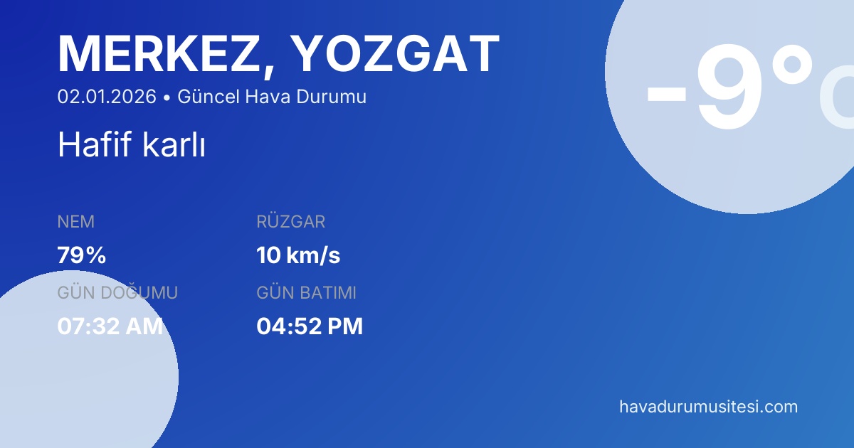 Merkez bölgesi için güncel hava durumu tahminleri, meteoroloji verileri ve detaylı hava durumu raporları. Sıcaklık değerleri, yağış olasılıkları, rüzgar hızı ve yönü, nem oranı ve görüş mesafesi bilgileri ile günlük planlarınızı yapabilirsiniz. MGM ve yandex hava durumu verileri ile güncel meteoroloji bilgilerine erişebilirsiniz.