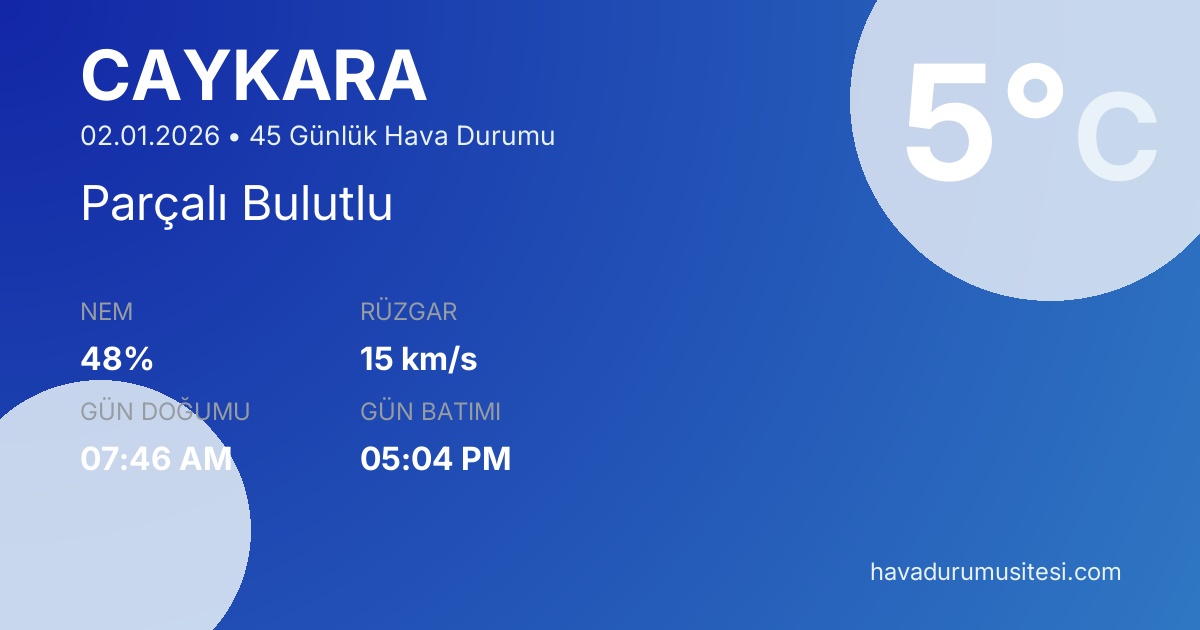 Çaykara için 45 günlük detaylı hava durumu tahmini. Son güncelleme: 02.01.2026 18:58 | Veriler uluslararası meteoroloji standartlarına uygun olarak işlenmektedir.