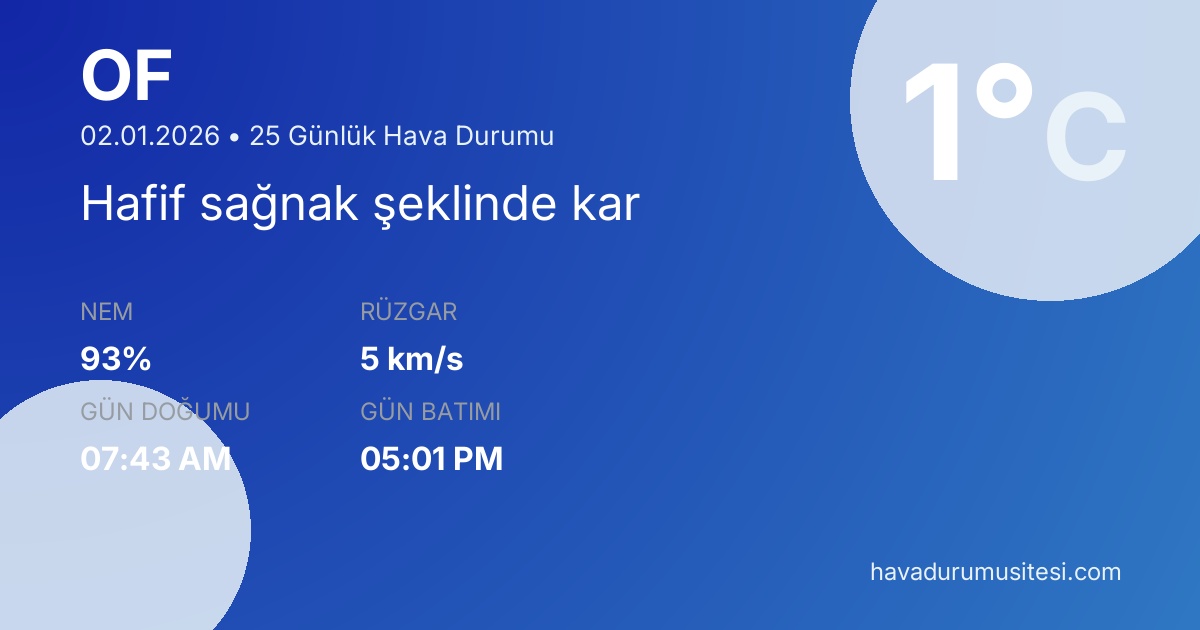 Of için 25 günlük detaylı hava durumu tahmini. Son güncelleme: 02.01.2026 09:46 | Veriler uluslararası meteoroloji standartlarına uygun olarak işlenmektedir.