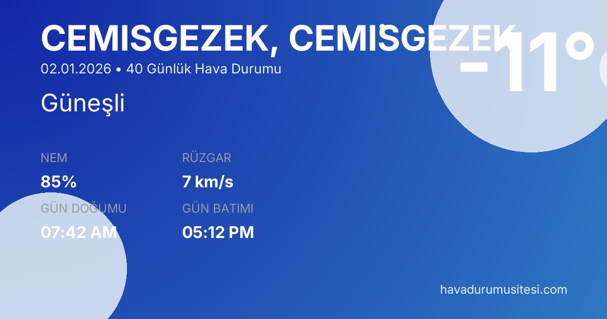 Önümüzdeki 40 gün boyunca sıcaklıkların -13°C ile 5°C arasında seyretmesi beklenmektedir. 6 gün yağışlı geçecek. 9 gün güneşli hava beklenmektedir. Çemi̇şgezek hava durumu tahminleri düzenli olarak güncellenmektedir. Meteoroloji verileri güvenilir kaynaklardan alınmakta ve sürekli güncellenmektedir. Son güncelleme: 02.01.2026 11:38