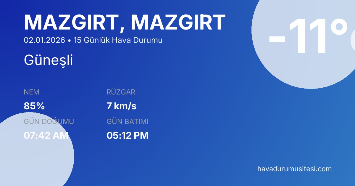 Önümüzdeki 15 gün boyunca Mazgi̇rt ilçesinde sıcaklıkların -19°C ile 2°C arasında seyretmesi beklenmektedir. Ortalama sıcaklık -6°C civarında olacaktır. 1 gün güneşli ve açık hava koşulları hakim olacak. Yaklaşık 3 gün yağışlı geçmesi bekleniyor. Kış mevsiminin özelliklerini taşıyan bu dönemde hava durumu tahminlerini düzenli takip etmeniz önerilir.