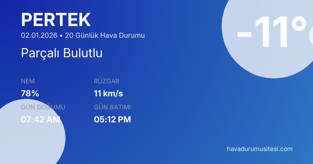 Pertek için 20 günlük hava durumu tahminleri. Şu anda sıcaklık -11°C ve hava durumu Parçalı Bulutlu. Hissedilen sıcaklık -17°C. Nem oranı %78. Rüzgar hızı 11 km/s. Pertek için güncel meteoroloji bilgileri, bugünkü hava durumu, yarınki tahmin ve 48 saatlik saatlik analiz sayfalarımızda detaylı bilgiler bulunmaktadır.