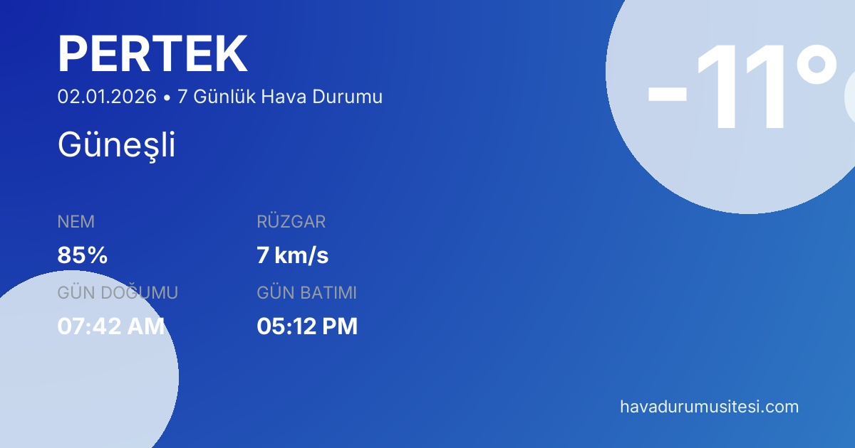 Önümüzdeki 7 gün boyunca sıcaklıkların -13°C ile 3°C arasında seyretmesi beklenmektedir. 3 gün güneşli hava beklenmektedir. Pertek hava durumu tahminleri düzenli olarak güncellenmektedir. Meteoroloji verileri güvenilir kaynaklardan alınmakta ve sürekli güncellenmektedir. Son güncelleme: 02.01.2026 15:14
