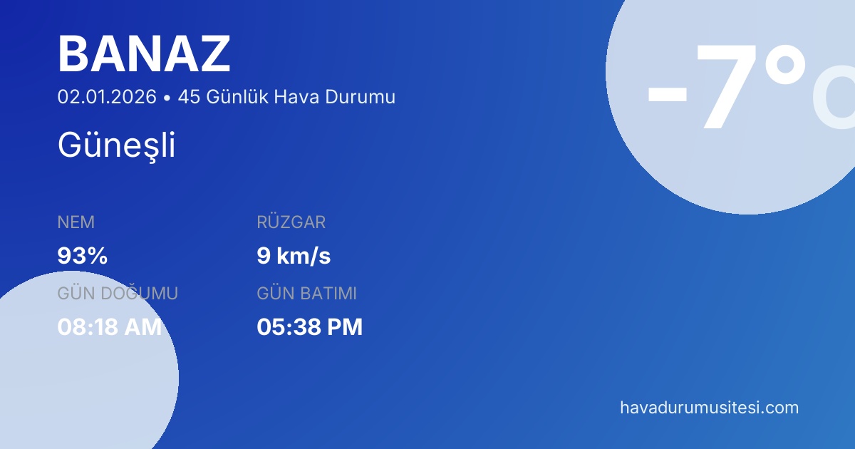 Önümüzdeki 45 gün boyunca sıcaklıkların -12°C ile 15°C arasında seyretmesi beklenmektedir. 14 gün yağışlı geçecek. 16 gün güneşli hava beklenmektedir. Banaz hava durumu tahminleri düzenli olarak güncellenmektedir. Meteoroloji verileri güvenilir kaynaklardan alınmakta ve sürekli güncellenmektedir. Son güncelleme: 02.01.2026 09:56
