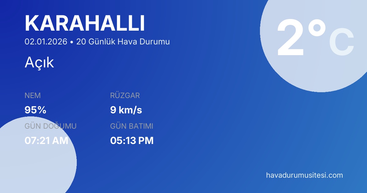 Karahalli için 20 günlük detaylı hava durumu tahmini. Son güncelleme: 02.01.2026 13:42 | Veriler uluslararası meteoroloji standartlarına uygun olarak işlenmektedir.