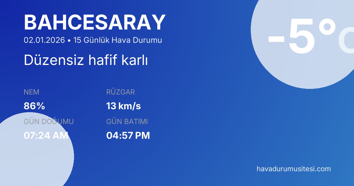 Önümüzdeki 15 gün boyunca Bahçesaray ilçesinde sıcaklıkların -15°C ile 10°C arasında seyretmesi beklenmektedir. Ortalama sıcaklık -2°C civarında olacaktır. 11 gün güneşli ve açık hava koşulları hakim olacak. Yaklaşık 1 gün yağışlı geçmesi bekleniyor. Kış mevsiminin özelliklerini taşıyan bu dönemde hava durumu tahminlerini düzenli takip etmeniz önerilir.