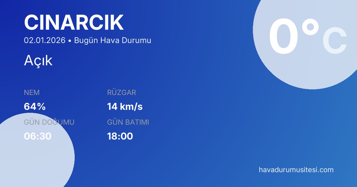 Çinarcik bugün hava durumu tahminleri düzenli olarak güncellenmektedir. 7 günlük haftalık tahmin ve 30 günlük uzun vadeli tahmin sayfalarımız ile farklı zaman dilimleri için planlama yapabilirsiniz. Meteoroloji verileri güvenilir kaynaklardan alınmakta ve sürekli güncellenmektedir. Son güncelleme: 02.01.2026 07:48