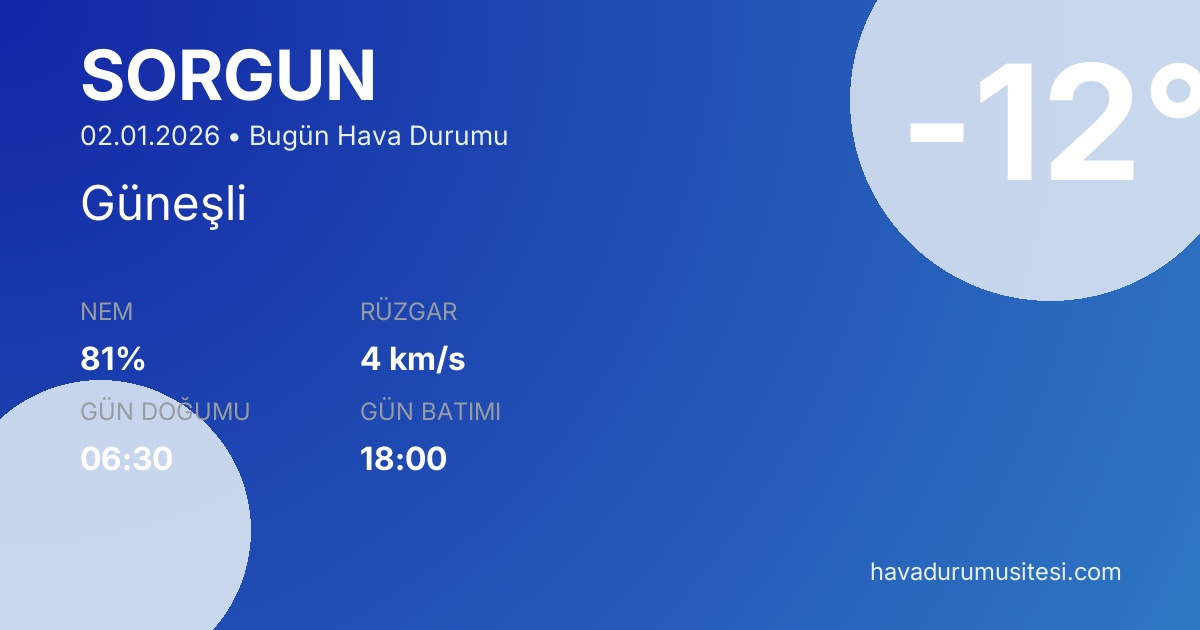 Sorgun bugün hava durumu tahminleri düzenli olarak güncellenmektedir. 7 günlük haftalık tahmin ve 30 günlük uzun vadeli tahmin sayfalarımız ile farklı zaman dilimleri için planlama yapabilirsiniz. Meteoroloji verileri güvenilir kaynaklardan alınmakta ve sürekli güncellenmektedir. Son güncelleme: 02.01.2026 09:53