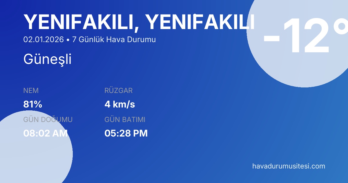 Önümüzdeki 7 gün boyunca sıcaklıkların -19°C ile 5°C arasında seyretmesi beklenmektedir. 2 gün güneşli hava beklenmektedir. Yeni̇fakili hava durumu tahminleri düzenli olarak güncellenmektedir. Meteoroloji verileri güvenilir kaynaklardan alınmakta ve sürekli güncellenmektedir. Son güncelleme: 02.01.2026 10:15