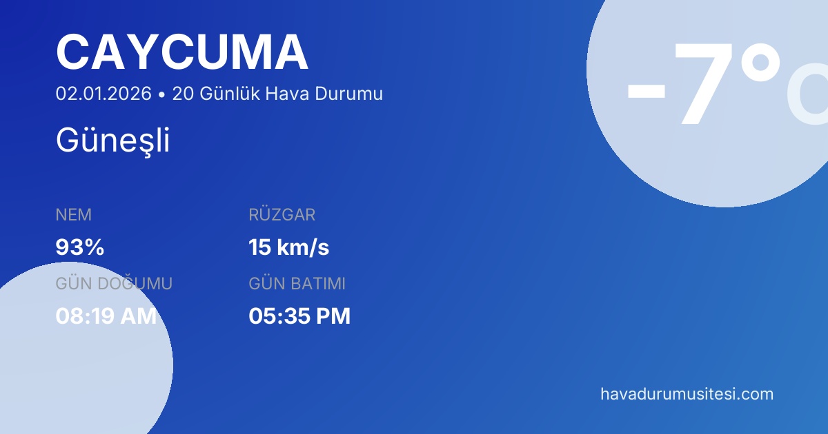 Önümüzdeki 20 gün boyunca sıcaklıkların -9°C ile 19°C arasında seyretmesi beklenmektedir. 7 gün yağışlı geçecek. 11 gün güneşli hava beklenmektedir. Çaycuma hava durumu tahminleri düzenli olarak güncellenmektedir. Meteoroloji verileri güvenilir kaynaklardan alınmakta ve sürekli güncellenmektedir. Son güncelleme: 02.01.2026 15:23